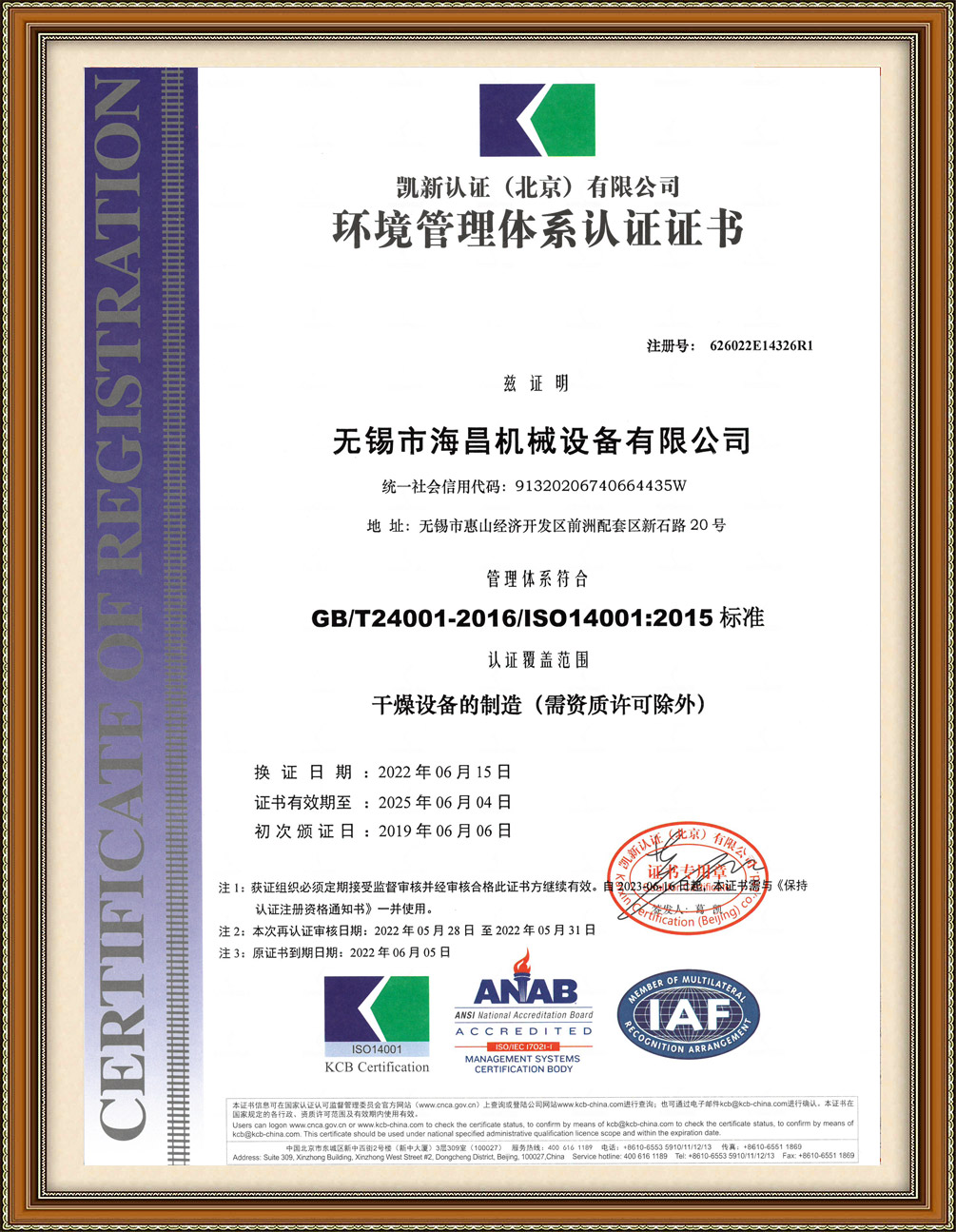 ISO14001證書(2019-2025年)
