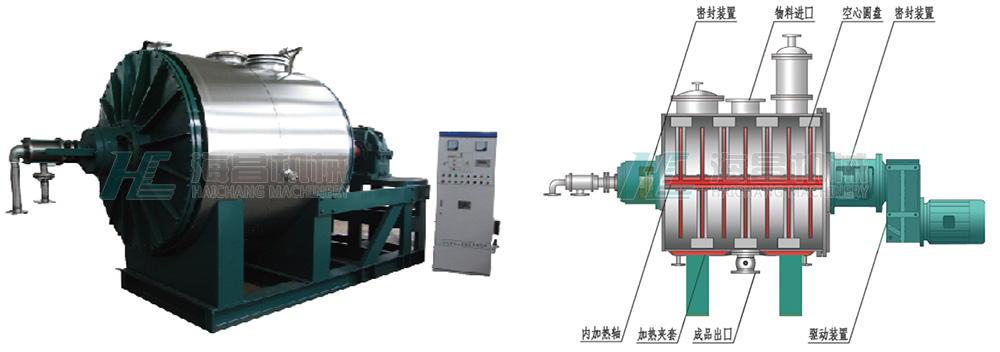 本機(jī)的主要結(jié)構(gòu)如圖所示,在一個帶夾套的臥式容器內(nèi)安裝有空心軸和許多空心圓盤(或螺帶)攪拌裝置及攪拌機(jī)構(gòu),這些空心圓盤(或螺帶)攪拌裝置在驅(qū)動裝置的帶動下與空心軸及攪拌機(jī)構(gòu)一起旋轉(zhuǎn)。